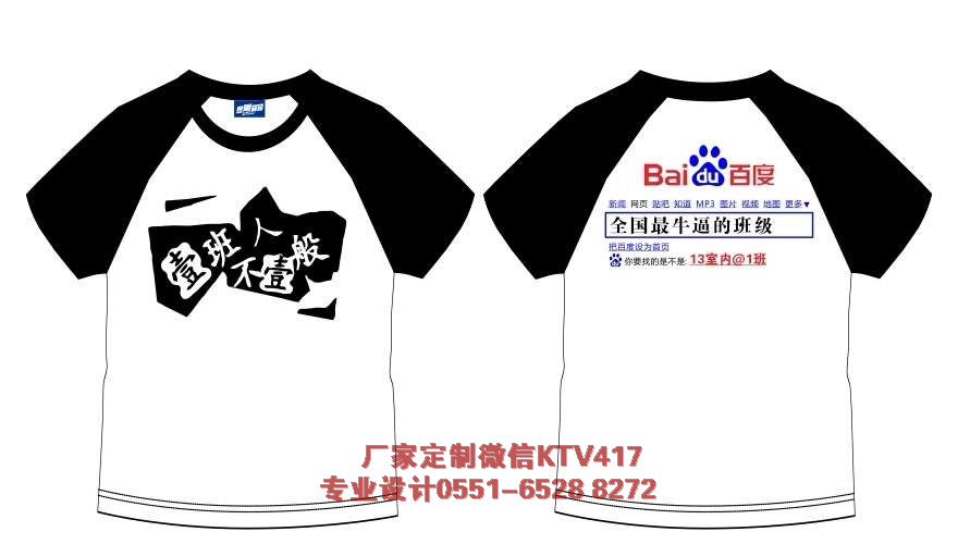 壹班班級(jí)服裝采用的是白色的插肩袖文化衫,正面是一班人不壹班,后面是百度搜索框全國最牛逼的班級(jí)。