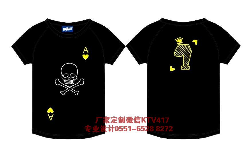 1班圖案,黑色的衣服左胸印刷黃色的愛心,A正胸印骷髏頭。很霸氣!仿制撲克牌中的A,做的設(shè)計(jì)。后面是1班帶上皇冠。