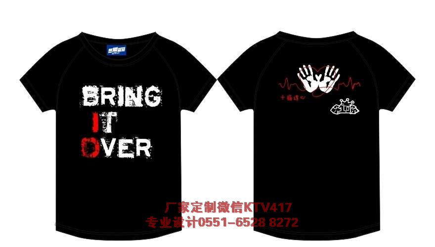 1班班徽設(shè)計,黑衣服印刷白色LOGO,和紅色的圖案,前面是BRING IT OVER 后面是愛心手掌。