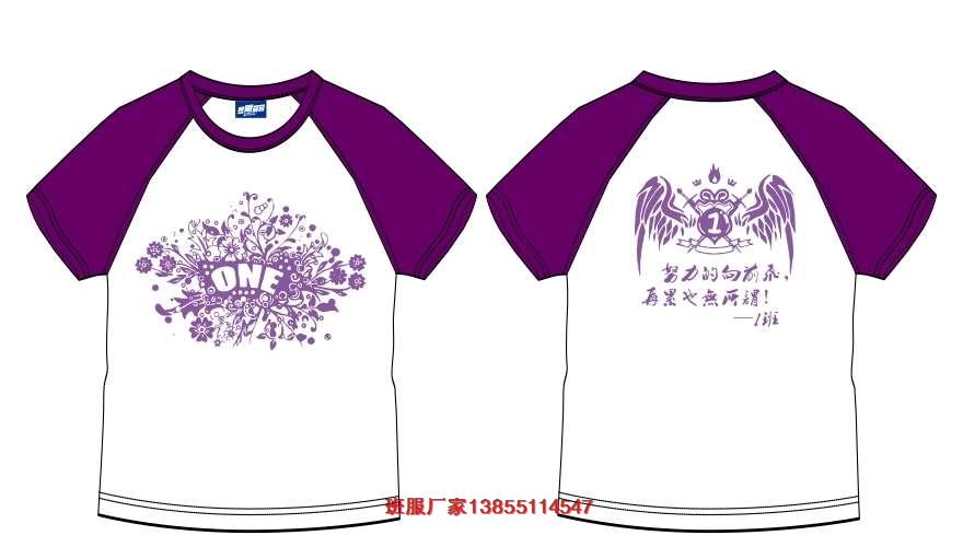 一班班級文化衫LOGO,該班班服,采用的是短袖文化衫,款式為紫色插件袖,前后印刷紫色的班級LOGO。很酷。