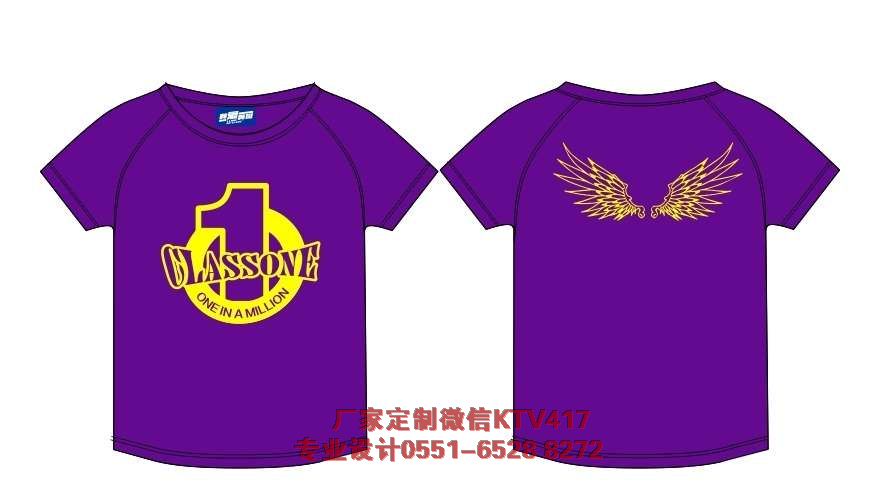 采用的是紫色的圓領(lǐng)文化衫,前面印 CLASS one,大號(hào)的數(shù)字1,充當(dāng)圖案,后面是黃色的翅膀,寓意一班騰飛。紫色的衣服配上黃色的圖案很喜慶。視覺效果不錯(cuò)!