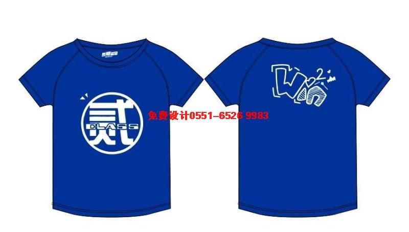 藍色圓領(lǐng)2班班服,底衫采用藍色T恤衫,前面印圓圈大寫的貳,CLASS,后面印刷白色的WIN2