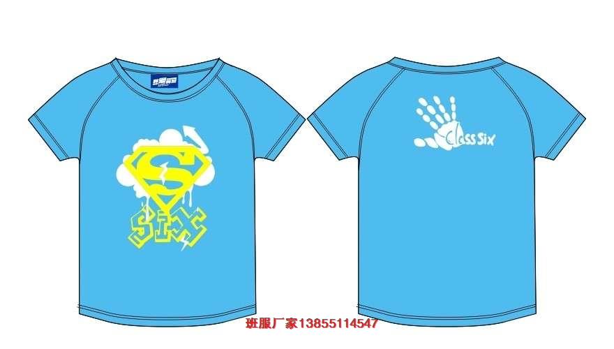 六班班服款式,六班班服款式采用的是藍(lán)色底衫,前面是超人鉆石圖案,下面是SIX,后面的班服圖案是手掌,CLASS SIX代表6班。