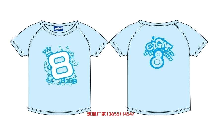 8班班服圖案,8班版衫LOGO該款8班班服采用的是淺藍(lán)色的圓領(lǐng)T恤,前面印刷大的數(shù)字8為主要圖案,后面是小的數(shù)字8為圖案,圖案顏色為深藍(lán)色。