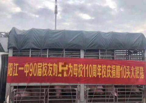 近日,廣東陽江一中迎110周年校慶,一名校友為母校捐贈(zèng)了10頭大肥豬,用貨車直接拉到了學(xué)校。學(xué)校老師說,這些豬肉將在校慶時(shí)供給師生享用,校友的初心是想感激母校,很好的一個(gè)校友。